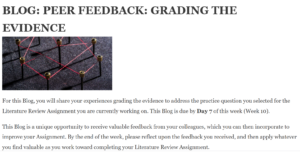 For this Blog, you will share your experiences grading the evidence to address the practice question you selected for the Literature Review Assignment you are currently working on. This Blog is due by Day 7 of this week (Week 10).